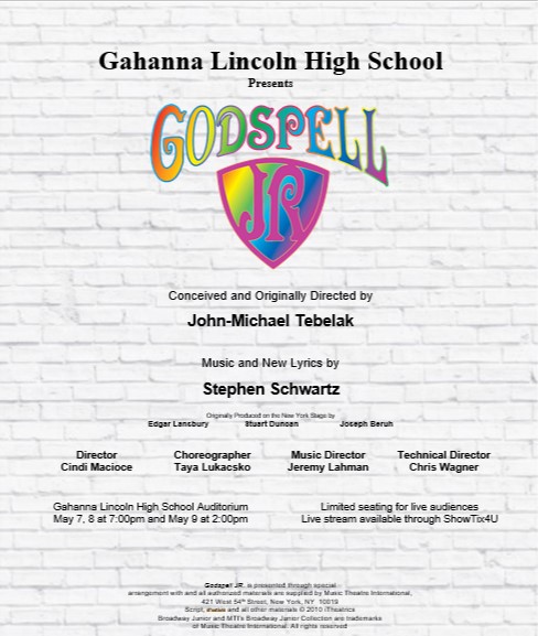 Tickets are now on sale for Live-streaming of Godspell, Jr. The show will run Friday, May 7 and Saturday, May 8 at 7 p.m. and Sunday, May 9 at 2 p.m. This is truly a live-streaming event, not a recorded event, and will be streamed as the show is being performed live in the GLHS auditorium. Don’t be late!