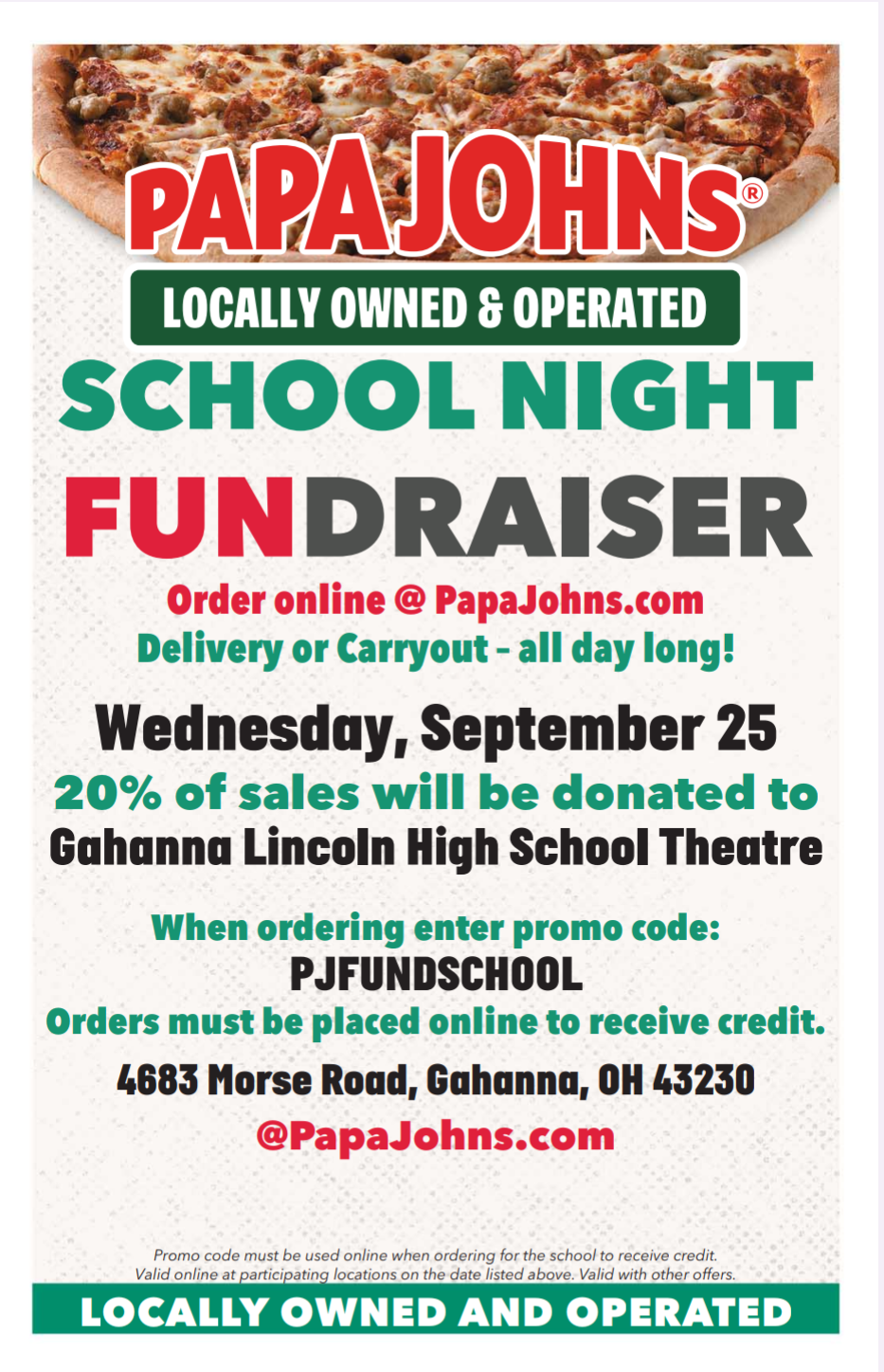 Grab a yummy bite and support GLHS Theatre. Reference the flyer below when ordering. Online orders only count for the fundraiser, use code PJFUNDSCHOOL. As always, we appreciate your support of theatre at GLHS!